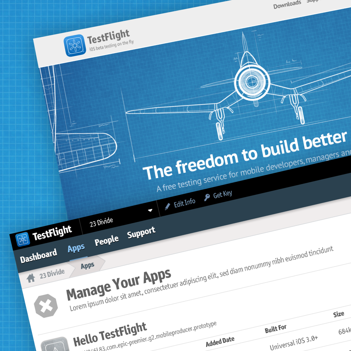 From the start, TestFlight wasn’t just about functionality—it had personality. From the first demo, Ben came up with the name, and designer Neven Mrgan created an initial concept and icon that although simple, sparked my imagination and inspired my direction for iterations to come: the blueprint of a propeller. In the coming months, I worked with creative prodigy and illustrator Vanja Mrgan to expand it, building a cohesive experience around our mascot, TestFlight Guy—an old-timey pilot scattering app icons across a blueprint field.